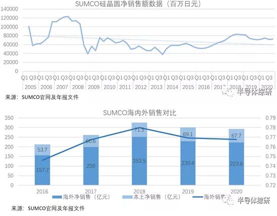 此外,對(duì)SUMCO公司近六年的海外銷售額進(jìn)行了統(tǒng)計(jì)分析,不難發(fā)現(xiàn)SUMCO公司所生產(chǎn)的硅晶圓產(chǎn)品,平均每年近八成會(huì)出口到海外銷售,日本本土的硅晶圓消耗量并不大。