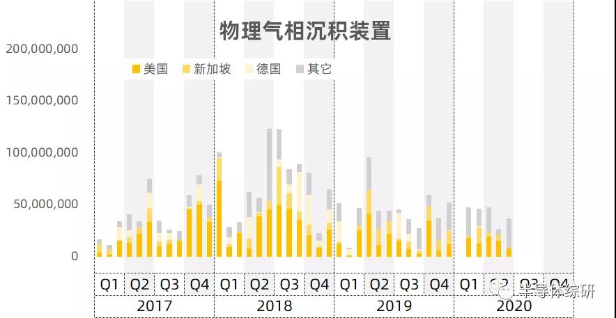 與熱處理擴(kuò)散設(shè)備和CVD設(shè)備不同,我國進(jìn)口的PVD設(shè)備的高峰在2018年。2019和2020進(jìn)口數(shù)額反而有下降趨勢(shì),而且金額總數(shù)也相對(duì)偏低。同期進(jìn)口只有21億美金